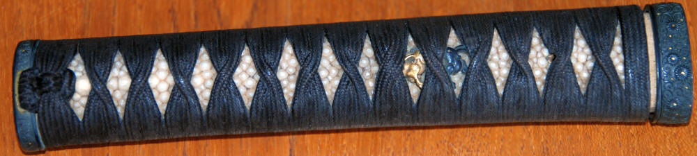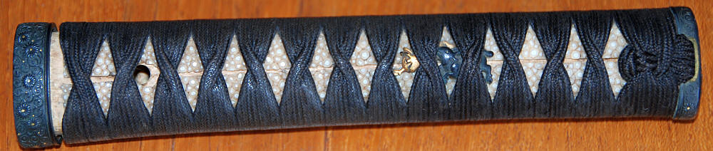 The tsuka is black ito over high quality same, with gold and shakudo menuki, ko-kinko fuchi-kashira Muromachi or Momoyama. The Higo s tsuba is an iron oval sukashi of pine in the style of Kamiyoshi, 7.3 cm high x 6.6 cm wide 5.1 mm thick, with NBTHK Hozon kanteisho. Goto kogai shakudo branch and leaves and gold plum on a very fine nanako ground. A very fine black lacquer ribbed saya free from dents, shakudo kojiri.