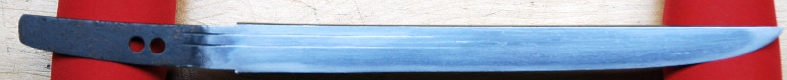 An ubu tanto, signed nijimei Nobukuni. Hirazukure, iroi mune, koshizori, (the majora curve at the machi), and a very slight sakizori at the very front of the blade. Two mekugiana, the earliest in style for mounting with the mekugi central in the tsuka ssen in Kamakura and early Nambokucho/. Bohi and soebi / futatsubi. Hawatare: 8 sun 4 bu 4.8 rin (25.6 cm / 10.078'). Motomaba: 1.5 cm Kasane: 2.5 mm. Weak suguba hamon, perhaps exposed to heat. Rolling masame mixed with itame. Clean, but needs a polish. In old shirasaya, gilt copper habaki.