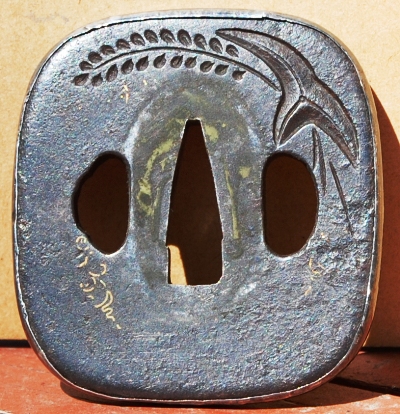 A tsuba signed, Aizu Ju / Shoami. Carved water plantains katakiribori and keibori, with gold nunome decorations, and a gilt mimi. God color and codition.