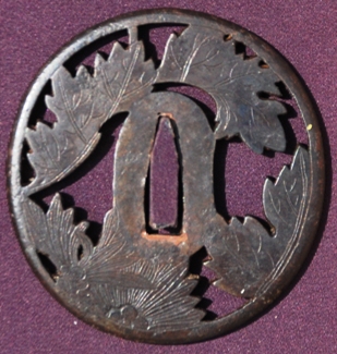 An Akasaka kiku sukashi tsuba. 74.5 cm x 70.4 cm. Kanteisho by the Nihon Tosogu Kenkyukai attributing it to Akasaka late Edo., so it is reasonable to attribute this to Tadatoki.