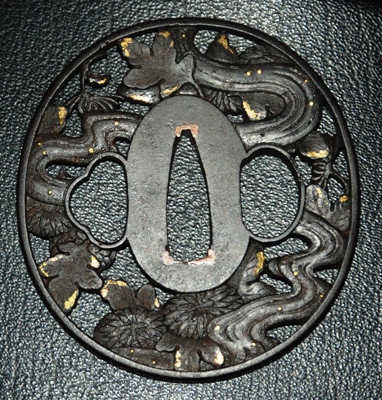 A tsuba with inlaid silver panels reading Bushu ju / Masahide saku, circa 1800. A kikusui sukashi of chrysanthemums and a steam. 7.75 x 7.23 x 4.2 mm. Haynes H 03954.0. $325