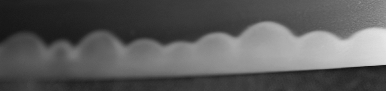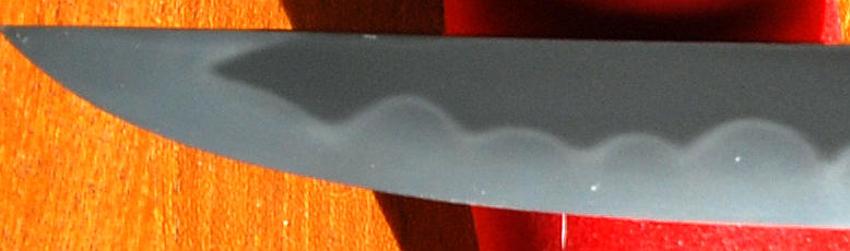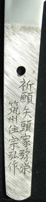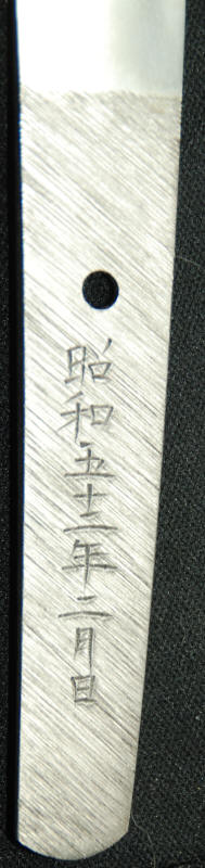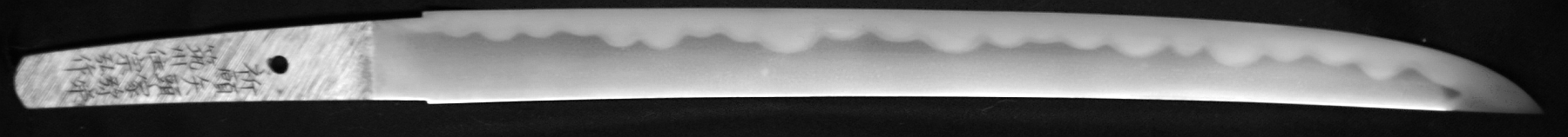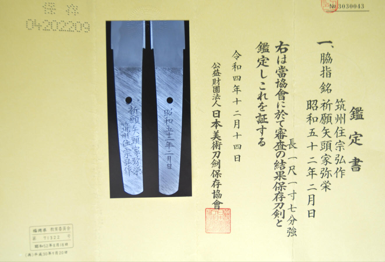 A hirazukure Wakizashi signed, Chikuzen Ju Munehiro Saku (Living in Chikuzen Munehiro made} Kigan Yagashira-ke Iyesaka (At the Yagashira estate of Itesaka). Showa Gojuni Nen Ni Gatsu Hi (A day in February 1977). Hawatare: 1 shaaku 1 sun 7 bu 8 rin. (35.7 cm / 14.06"). Motobaba: 3.07 cm. Kasane: 6.6 mm. Sori: 3 mm. Ko nie deki. O-gunome midare, -ashi iri, rich habuchi. Longish yakidashi in gunome. pointed boshi, medium kaeri. Tight itame hada with fine ji nie. In good polish, shirasaya, and niju gold foil babaki. NBTHK Hozon kanteisho.