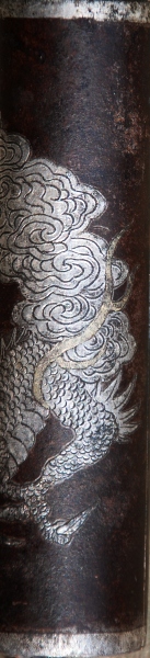 An important middle to late Edo ceremonial Fireman's ax, a treasure of the fire company, never to be used in fire fighting. 51.6 cm overall and a 8.2 cm blade. The wooden shaft is covered with a black lacquered iron sheath with Tokugawa mon in gold lacquer. Five iron support rings, and two large iron mon with silver nunome detailing. The blade is covered with thick silver nunome, and the ring that fits around the haft is decorated with Tokugawa mon and scrolling in gold and silver nunome. The large iron hook for securing the ax to an obe is decorated with silver nunome of water dragons, and a cartouche in the center is signed Myochin Saku in gold nunome. The iron butt piece is decorated with a silver nunome dragon, with gold eyes and tongue. This is an important one of kind item, and really belongs in a museum.