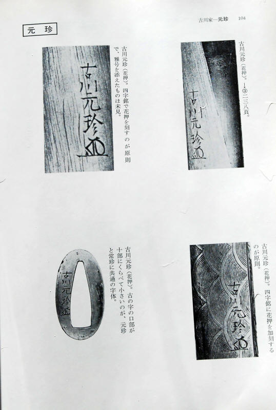 A Shibuichi tsuba signed, Furukawa Genchin (Kakihan). 7.4 cm x 7 cm x 4 mm. Silver gray shibuichi decorated with Fu dog and peonies in katakiribori and keibori. I have no idea about the stained area in the back. I don't know if it can just be cleaned, or if the tsuba will require Brian Tschrnega's patination. Fortunately, there is no damage to the plate. Ref. Haynes, Nihon Toso Kinko Daijiten H 00565.0, Wakayama, Toso KodoguMeiji Taisei , Vol. I pages 104-105