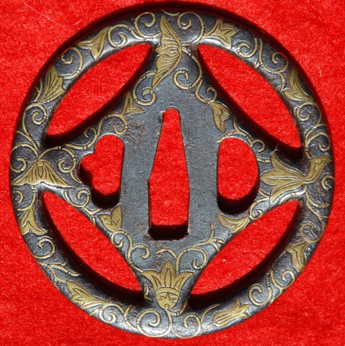 Kaga yoshiro inlay added to I what I think is an Umetada tsuba. Good color and inlay is only missing a few vines along the edge (see left hand picture, bottom, three and nine o'clock). 7.57 cm x 7.41 x 4.3 mm.