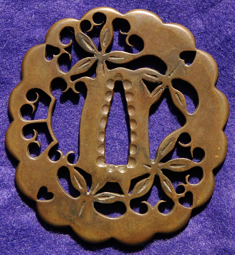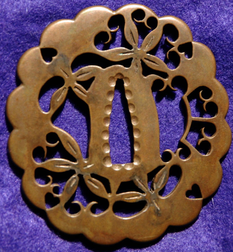 Circumstances have put this back on the market. A large shinchu sukashi tsuba 8.12 cm. x 7.68 cm. x 4.1 mm. Excellent condition. The tegane would indicate that this is a Kamiyoshi school piece. Purchased out of Germany some five years ago, with a compromised patina, so this was professionally recolored. As per Robert Haynes, "A very strange tsuba, to say the least. The Higo never did open work in brass. A Higo design, by an Umetada smith. The Umetada traveled all over, and copied everyone. If there was an artist making a tsuba, there would be an Umetada and a Shoami standing there watching them". "The tegane seem to be saying I want everyone to know I made this, but we don't know who that is." Dates 1800 or a bit later. $1,250