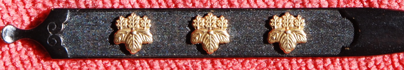 From a description of a tsuba (sold by an unschooled dolt), by Robert E. Haynes in Gai So Shi, page 103 " ... The shichi-go kiri mon has seven blossoms in the center and five on each side. This is the Imperial form of the mon, and very rare in any design used on fittings. ... Only a high imperial court official would have been able to have such ... on his sword."
