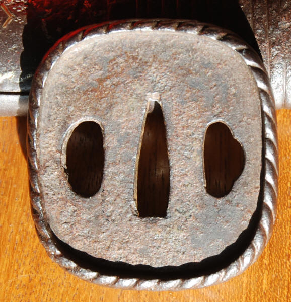 Mounted with plain iron fuchi-kashira, likely just part of an iron tsuka which is carved to resemble parallel cord wrap, with large Jakushi style plates with gold and silver nunome in place of menuki. As per Robert Haynes, when shown the tsuka, "I have no idea. I have never seen anything like it". The iron Shonai tsuba circa 1700 (as per Robert Haynes), (6.4 cm x 6 cm.) has a wide mimi (1.1 cm.) with diagonal cord design on the outside in keeping with the design of the tsuka. The saya is fine polished and lacquered shark skin, with copper band and a large iron kojiri. An excellent gold and silver two piece habaki, with fine vertical lines underneath an open diagonal crosshatch pattern