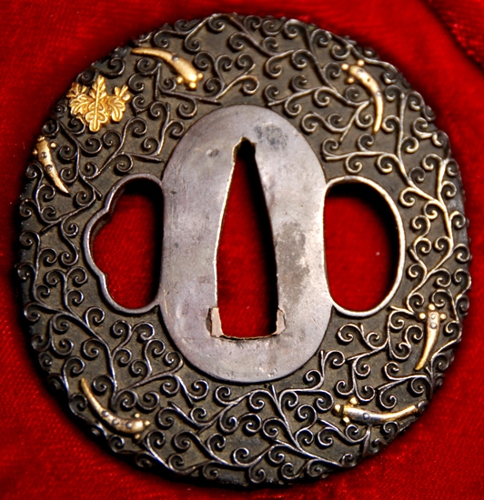 A married kirimon itumono (five piece set) with older NTHK papers issued by the elder Yoshikawa in 1979. All the tosogu, except the menuki, are shakudo nanako with gold kiri mon. The shakudo tsuba, with raised vines and kiri and ginger root in gold, is attributed to Mino Goto. Tsuba: 6.8 cm x 6.38 cm. Fuchi: 3.69 cm x 2.28 cm x 1.06 cm. Kashira: 3.33 cm x 1.68 cm x 7.7 mm. A good boxed set, or ideal for mounting. $2,900