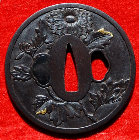 Signed Bushu ju Masatsune. Like new condition, lovely patina. Takabori mimi, decorated with gold nunome on the outer edge. Circa 1800. 7.41 cm x 7.44 cm x 4.1 mm. He signed both Bushu ju and Choshu ju, living both in Edo and Nagato.