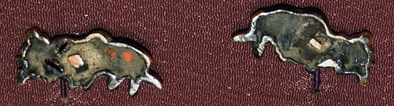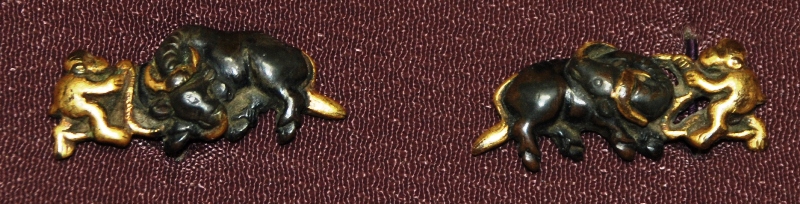 A nice gold and shakudo set of menuki of a monkey leading an ox. 3.03 cm x 1.27 cm x 5.1 mm. 3.09 cm x 1.29 cm x 5.8 mm. I am not 100% sure, but the gold appears to be utori, not electro plate, which of course would make them older and better. Good for either mounting or collecting. Boxed