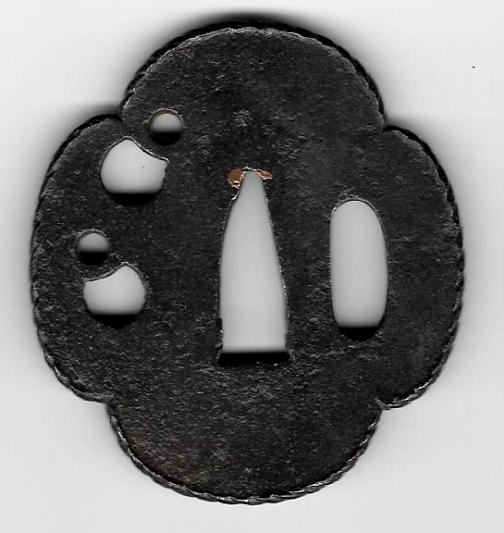 A Muromachi moku tsuba with a hammered rope patterned mimi. 6.63 cm x 59.7 cm. x 3.3 mm at the mimi. Good color and condition, being protected by a coat of clear lacquer. $200