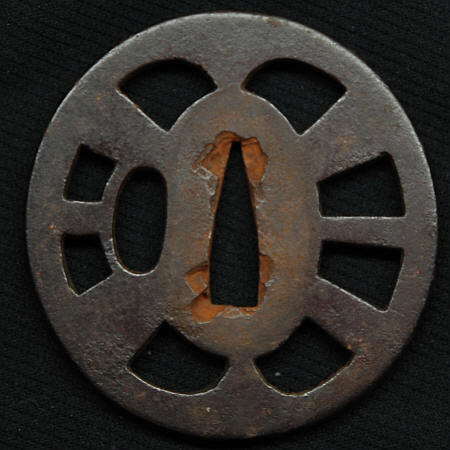 Iron Higo fuchi-kashira, mountain road design. Gilt menuki of gods of good fortune. Lacquered tsuka ito torn and coming apart. Iron sukashi tsuba. Black lacquer saya, a little chipping, and missing kozuka. An iron sukashi tsuba.