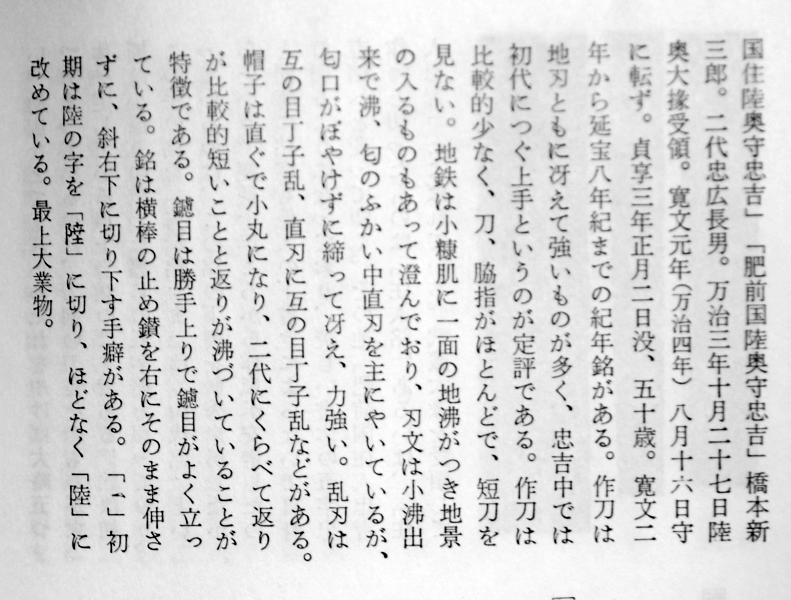 Mutsu no Kami was the third of the Hizen Tadayoshi school masters, active around Kanbun (1661 - 1673) Rated Jojo Saku in Nihon Toko Jiten - Shinto Hen. Tokuno's Toko Taikan rates him at 10,000,000 yen.