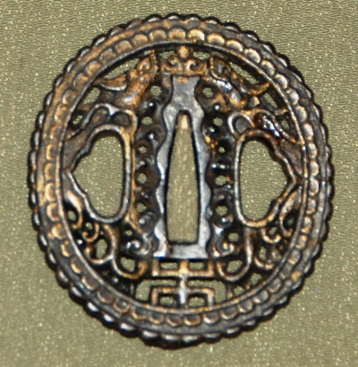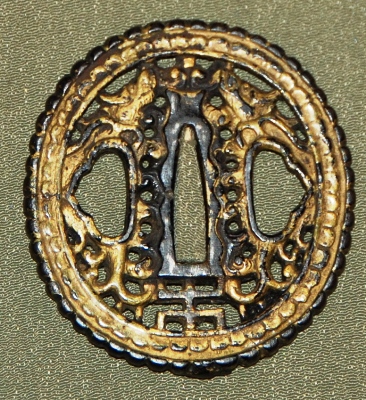 A small Canton Namban of dragons and a tama. Mounted for a hirazukure blade, so appropriate for either a small wakizashi or a tanto. The gilt on the face is almost intact, while the back is more worn. 6.25 cm x 5.75 cm x 4.4 mm. $135.