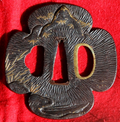 An excellent well cared for Nara tsuba with the usual mountain and fisherman theme in takazogan, with strong Amida yasuri. Gold highlights, copper face on the fisherman, and a gold sekigane in the kozuka ana. 7.75 cm x 74.2 cm x 3.7 mm. This is a tsuba for the serious collector. $450.