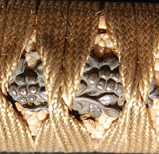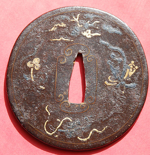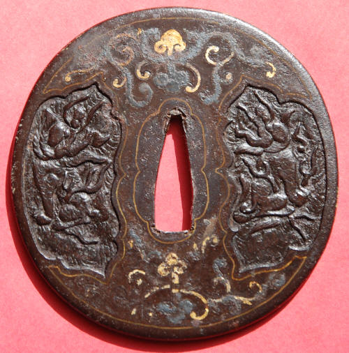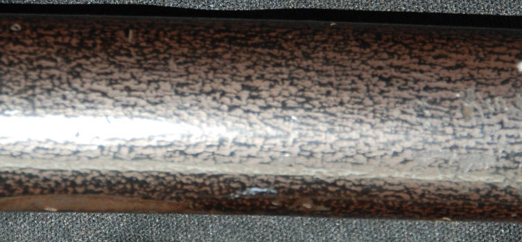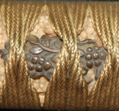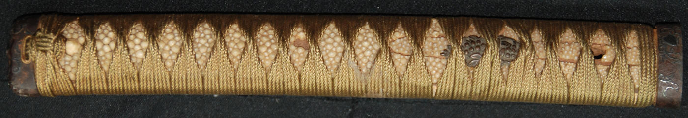 The tan tsuka has negligible fuchi-kashira, good old same with repairs, copper grape menuki. The large Namban tsuba is clearly an import. Very good intaglio dragons, and most of the nunome is intact. 8.66 cm x 8.465 cm x 4.39 mm. This will benefit from a little judicious cleaning, and might well be worth keeping for itself. The brown and black stippled saya is in good shape, missing only the horn kojiri. $2,500