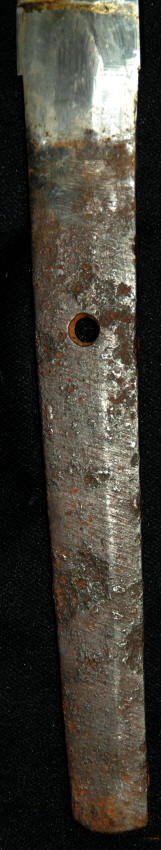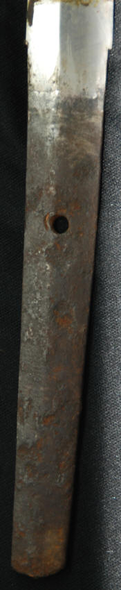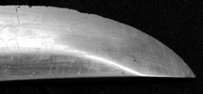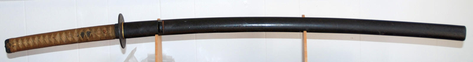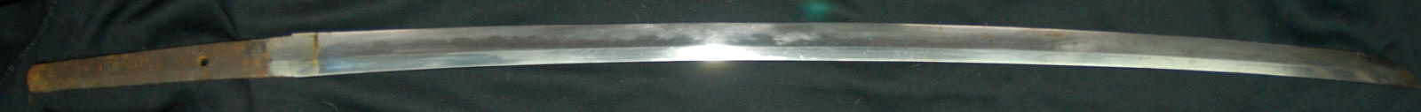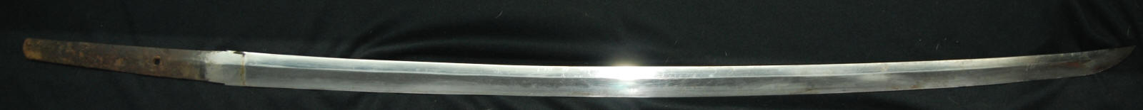 Out of the woodwork, a long sue koto mumei katana. Ubu, mumei, shinogizukure, iroi mune, slightly extended chu-kissaki. shallow sori, extended chu kissaki. Hawatare: 2 shaku 5 sun 5 bu 4 rin, (77.4 cm or 30.47"). Motohaba: 3.094 cm. Sakihaba: 2.129 cm. Kasane: 8.57 mm. Gunome togare, nado. Boshi becomes suguba. Itame in the ji, masa in the shinogi ji. Tiny edge chips in the kissaki.
