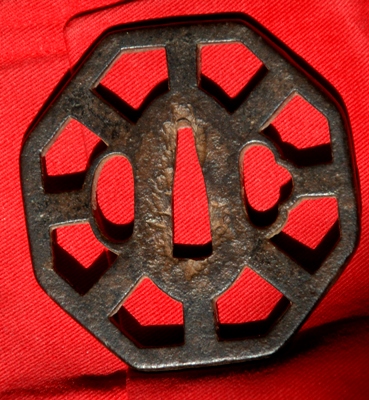 An octagonal spoked Shoami Tsuba. Early Edo. Good color and profuse granular tekotsu throughout the plate. The plate is extremely dense. A functional no nonsense guard. 7.32 cm x 7.12 cm x 5.7 mm. $275
