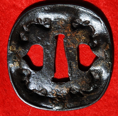 An interesting rounded square tsuba, very dense and black metal, brass highlight. 7.3 cm xx 7.4 cm x 5 mm. This is a gomokuzogan added to a rugged ishime plate. Good globular tekotsu in the rim. A serious collector tsuba.