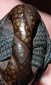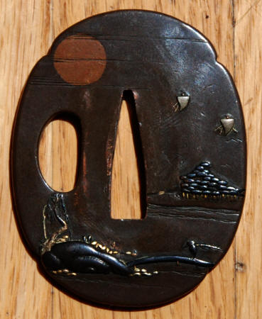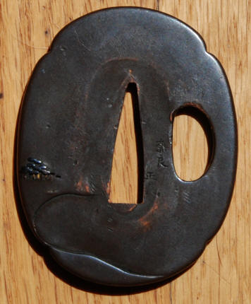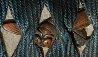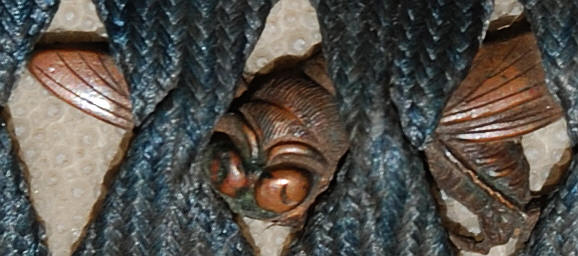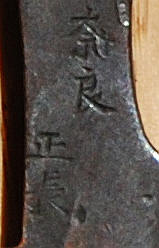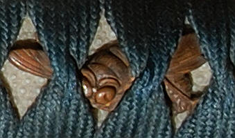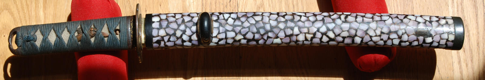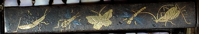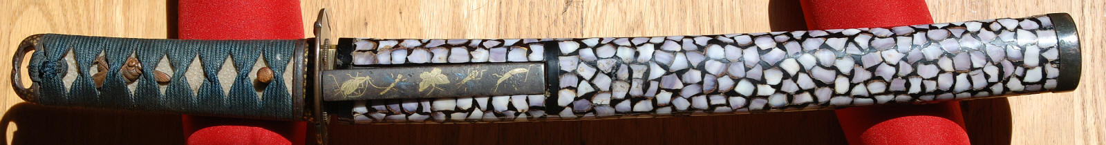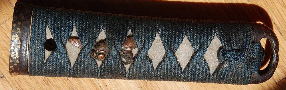 Blue tsuka maki over white same with large copper bubble bee menuki. The fuchi-kashira are iron with gold cherry blossoms. There is a fine Higo fuchi-kashira: the fuchi is waisted, the kashira made to appear to be two intertwined pieces. The saya is abalone shell inset in black lacquer, with a clear lacquer coat. The koiguichi, kurikata, and kojiri are black horn. The kozuka is iron with gold Kaga zogan of insects and a butterfly. The tsuba is signed Nara Masanaga. There were two generations of Nara Masanaga. The first 1725 - 1750 a student of Nara Toshinaga. The second, the adopted son of the first Masanaga, was the nephew, and student of, Isando Joi. He worked around 1750. Ref. Haynes. The Index of Japanese Sword Fittings and Associated Artists, H 04250.0 & H.04251.0. Wakayama, Toso Todogu Meiji Taisei Vol. 1, pages 135 & 136. The first generation had many students. The second generation, several signatures. $3,500