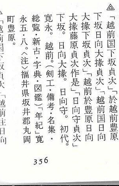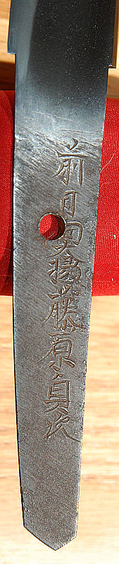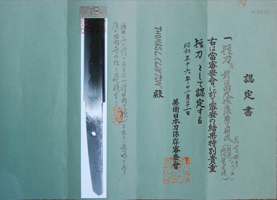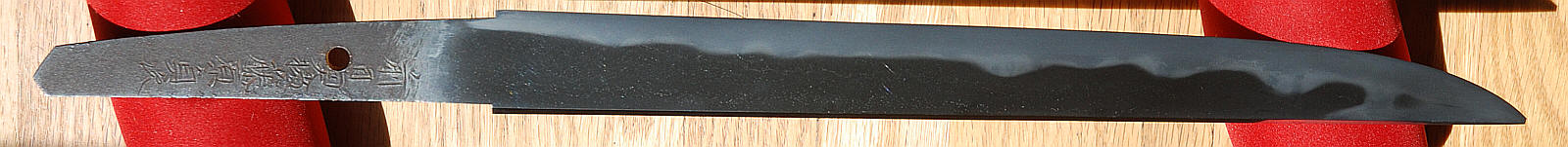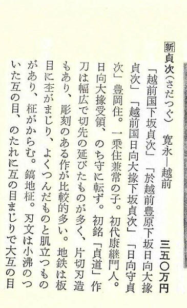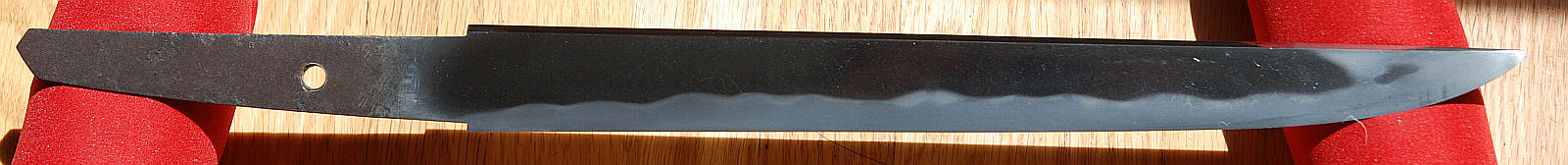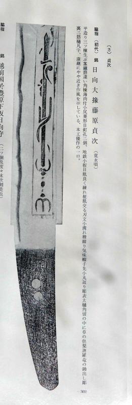A well mounted wakizashi by the first generation, Zen Hyuga Daijo Fujiwara Sadatsugu. Working around Kanei (February 1624 though December 1644) Ubu, one mekugiana, hirazukure, iroi mune. Hawatare: 1 shaku 7 sun 8 bu 5 rin (54.1 cm. / 21.3"). Motohaba: 2.54 cm. Kasane: 5.2 mm Gunome midare, gunome togare, ashi iri. yo, ha nie, hotsure, tobiyaki, ko-nie, muneyaki, nado. The hamon becomes hitatsura as it approaches, and becomes part of the hakikaki boshi with a wide elongated kaeri. The jigane is a brilliant itame with nagare, bright jinie, chikei, nado. He was of the Shimosaka school. Both first and second generations are rated with a double triangle in Nihonto Meikan. While the first is not listed, the second rated chujo saku in Fujishiro's Nihon Toko Jiten - Shinto Hen. Pictured in Shinto Taikan, Vol. 2. Valued at 3,500,000 yen in Toko Taikan.