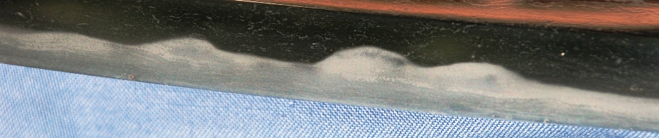 An ubu mumei wakizashi attributed to Sashu Jinrei Masazane. Hawatare: 1 shaku 5 sun 2 bu 58 rin (46.06 cm / 18.13") Motohaba: 3.17 cm. Sakihaba: 2.35 cm. Kasane: 6.3 mm. Ogunome midare, sunagashi, kinsuji, ha nie, gifu, nado. The boshi is hakikaki. Itame hada with jinie and chikei. Mounted in shirasaya with a niju gilt copper habaki. NBTHK Hozon kanteisho. Valued at 1,200,000 yen in Toko Taikan, by Tokuno.