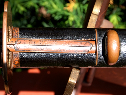Mounted in 19th century koshirae. Black leather tsuamaki over black same. The fuchi-kashira, koiguchi, kojiri, and kogaibashi are matching red copper with a texture of worn rock. The menuki are single mon. The kurikata and kaerizuno are matching red copper with incised vine pattern. The saya is textured black lacquer. The large red copper moku tsuba has puppies at play.
