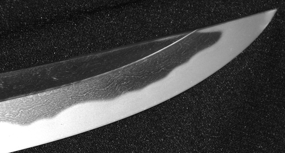 A recently polished shinto wakizashi, nagamei, Bishu Osafune Sukesada. 1 shaku 2 sun 7 bu (38.48 cm / 15.15"). Motohaba: 23.18 cm. Kasane: 4.5 mm. The hada is nioi deki hiroi gunome midare. The jigane is hadatatsu running itame and masame, small areas of o-mokume. NTHK kanteisho attributing the blade to Sukesada working in Genroku.