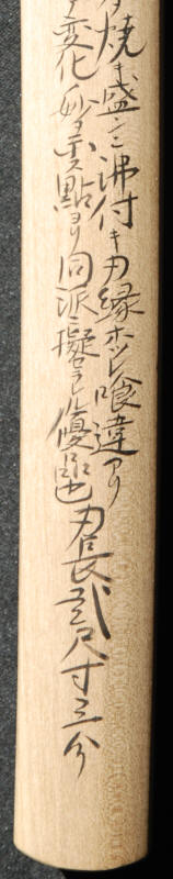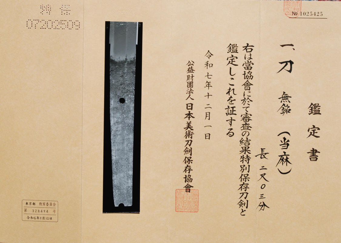 An o-surage mumei katana attributed to Taima. Shinogi zukure, shallow sori, high shinogi, iroi mune, chu kissaki. Hawatare: 2 shaku 0 sun 3 bu (61;51 cm or 24.21") . Motohaba: 2.7 cm. Sakihaba: 1.8 cm, Kasane: 6 mm Nie deki chu suguba ko-midare, with nijuba, nie fraying and koichigaiba, kinsuji, inazuma, sunagashi, coarse appearing hanie, nado. The boshi is Daien (big flame) yakizumi. Itame hadatatsu (stading up) and flowing. Ji nie. NBTHK Tokubetsu Hozon, sayagaki by Tanobe Sensei.