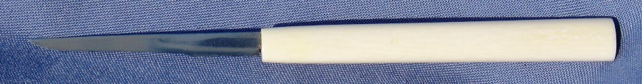 A small kogatana mounted as a tosu. Length: 7 cm. Overall length 22.9 cm (9"). Black lacquer saya and whale bone tsuka.