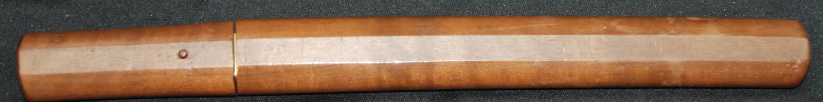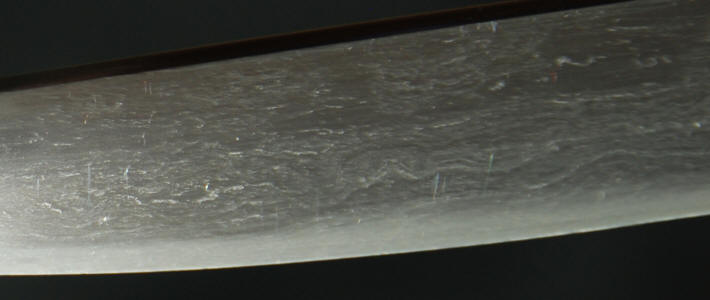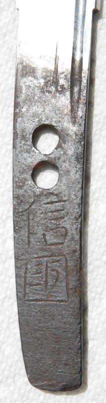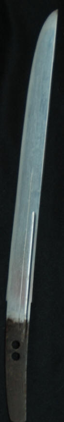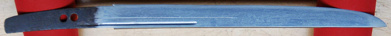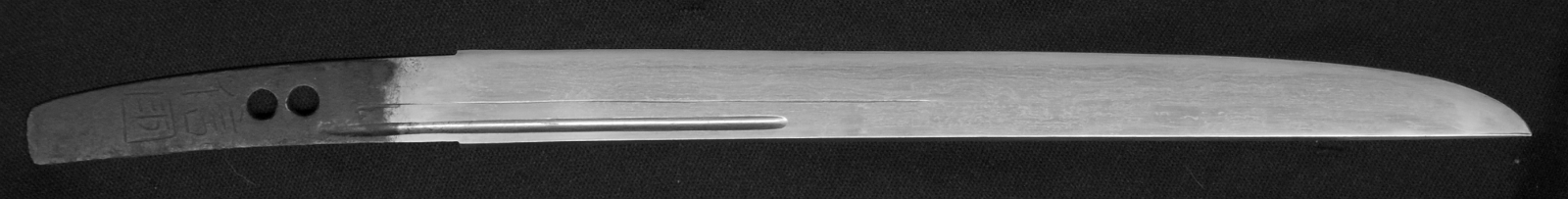 An ubu tanto, signed nijimei Nobukuni. Hirazukure, iroi mune, koshizori, (the majora curve at the machi), and a very slight sakizori at the very front of the blade. Two mekugiana, the earliest in style for mounting with the mekugi central in the tsuka ssen in Kamakura and early Nambokucho/. Bohi and soebi / futatsubi. Hawatare: 8 sun 4 bu 4.8 rin (25.6 cm / 10.078'). Motomaba: 1.5 cm Kasane: 2.5 mm. Weak suguba hamon, perhaps exposed to heat. Rolling masame mixed with itame. Clean, but needs a polish. In old shirasaya, gilt copper habaki.