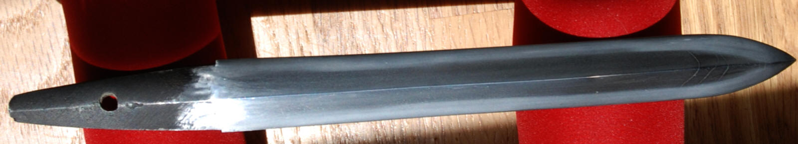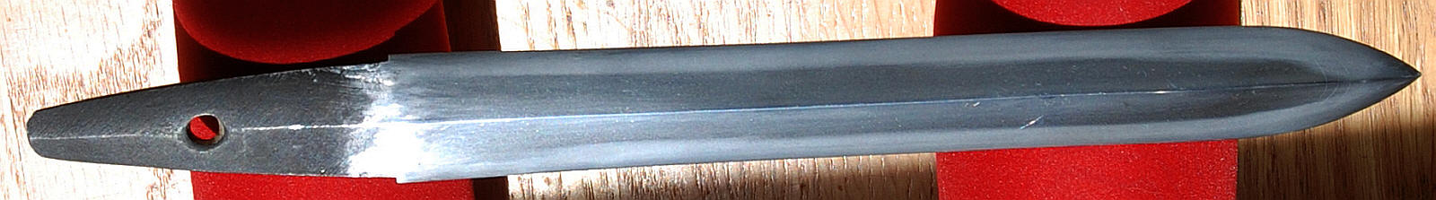 An o-suriage koto Yamato ken in interesting Meiji period koshirae. Hawatare: 5 sun 7 bu 2 rin (17.3 cm / 6.82) Mihaba: 2.34 cm Kasane: 6.2 mm. An irregular suguba-ko-midare with an area of gunome togare midare n ko nie. There is a very rich and bright habuchi, there are very bright kinsuji. The polish is heavy keisho, because hamon runs down to the edge back at the machi on one side, appearing to end in ito suguba, or perhaps runs off the edge. Due to the location, this is not a fatal flaw. The jigane is itame nagare with masame in the edge, packed with ko-nie. This deserves a proper polish to bring out its beauty.