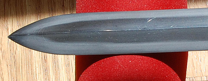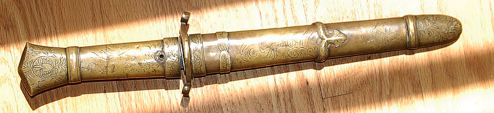 The sentoku koshirae are an amalgam of of Japanese and western influence. The saya is pretty stanard Japanese taste with a dragon in katakiri bori and kei bori, however instead of a kurikata, there is a western style hook that would fin into a leather frog. The tsuba was replaced with a western style S shaped bar guard, and the kashira/kabuto gane, is something I would expect to see in Chinese or SE Asian mounts. There are a few small dents as shown. This very interesting koshirae is probably unique.