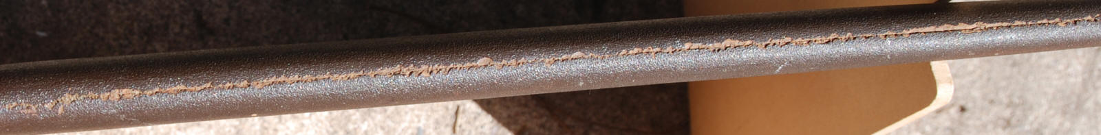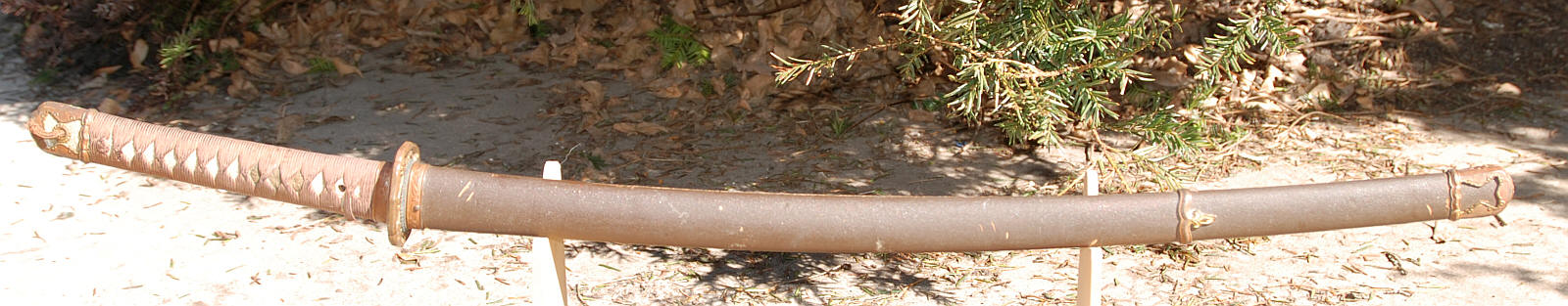 Mounted in early army koshirae, with a lacquered wood saya. The mon has been removed from the kabutogane. The tsukamaki is coming apart and some is missing. I cannot tell if there had been a hanger, though that seems likely. The saya is unfortunately split along the seem, though still solid. The copper habaki is older and of good quality.