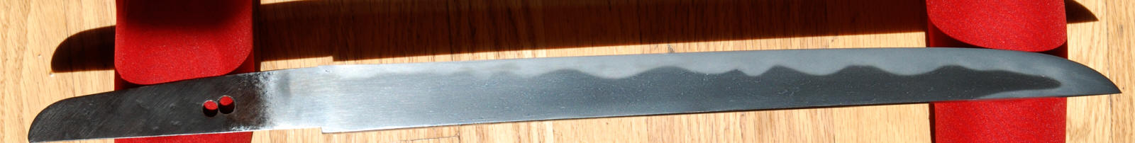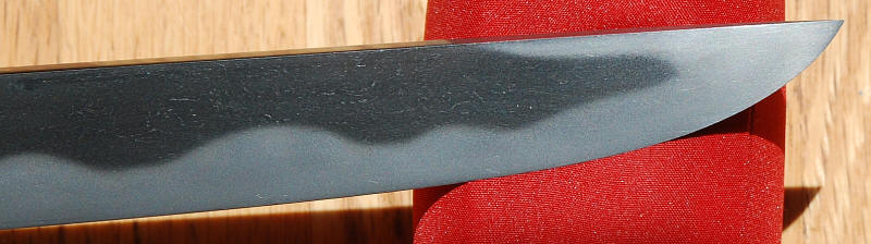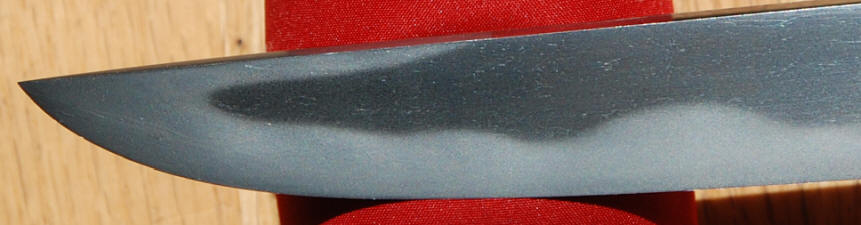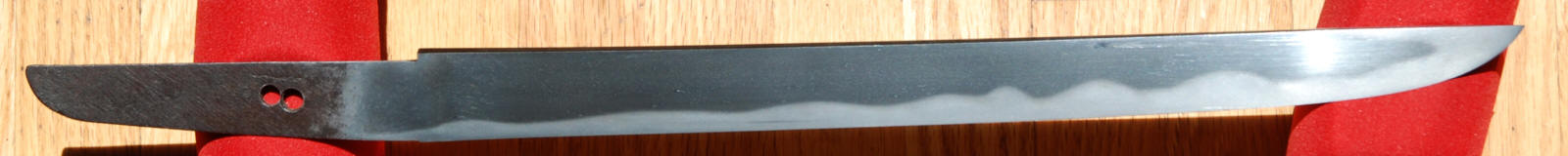 A slightly extended tanto, or for you purest a small wakizashi, Hirazukure, muzori, iroi mune, mumei, two mekugiana. Hawatare: 1 saku 0 sun 2 bu ( 30.95 cm / 12.19") Motohaba: 2.64 cm. Kasane: 6.3 cm. Ko nie deki, gunome midare, ashi iri. ha nie, sunagashi, kinsuji, muneyaki, nado. Itame mixed with masame, jinie. The boshi is hakikaki. The heavy keisho polish conceals what is a very flamboyant blade.