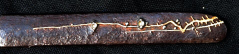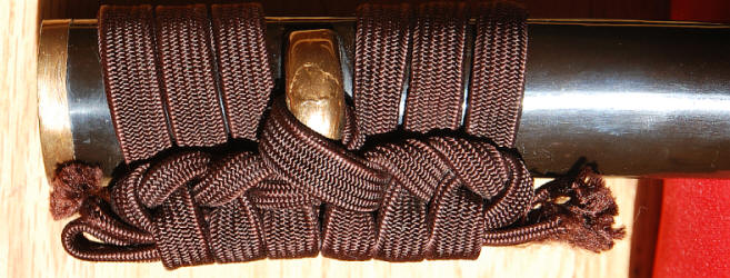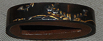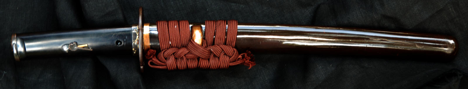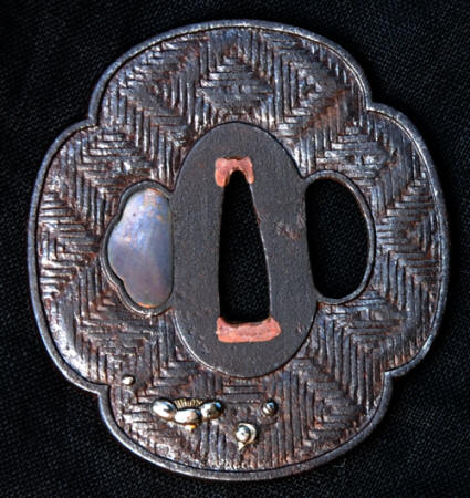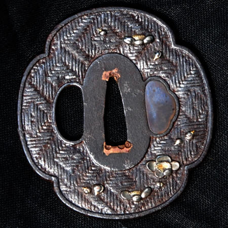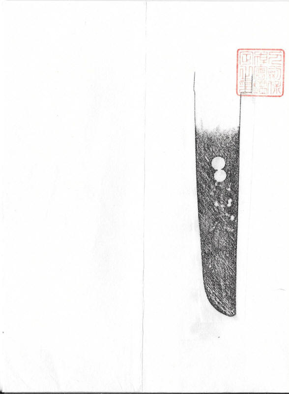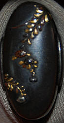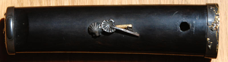 The tsuka appears to be ebony or rose wood with an unsigned Nara school fuchi-kashira of very dark shibuichi, decorated in silver and gold takazogan. The menuki are fans and scallop shells copper, gold, silver and shakudo. The iron kozuka is decorated with a gilt branch. The saya is good quality black lacquer (natural black lacquer is actually brown). Unfortunately, the previous owner found it necessary to paint to koiguchi and kurikata with gold paint. Fortunately, he had a steady hand, and may be easily overlooked.. An iron moku Sendai Shoami style tsuba 7.37 cm x 6.79 cm x 3.9 mm. A weathered iron kozuka with a flowering branch. NTHK/NPO Kanteisho.