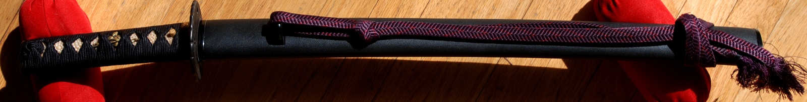 The well made saya is modern. The tsuka is black tsuka ito over white same, brass samurai menuki, and a married fuchi-kashira of dragons. Silver katakiribori kashira, and a shibuichi nanako fuchi with gilt dragon. The well patinaed Edo period tsuba has four boar eye sukashi, and Amida yasuri. Good quality purple sageo.