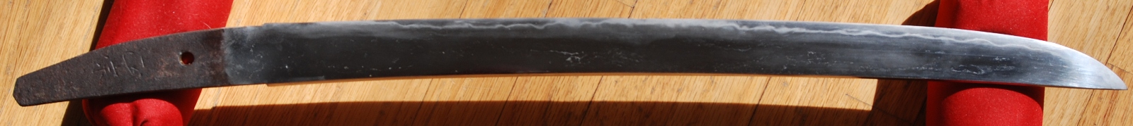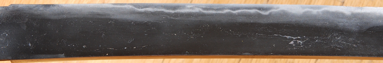 A hirazukure wakizashi signed nijimei, Masamune. Hawatare: 1 shaku 1 sun 3 bu 3 rin (40.4 cm / 15.91 inches) Motohaba: 2.89 cm. Kasane: 5.6 mm. Gunome midare, saiba, with the hamon dropping off and reappearing toward the machi. There is defined and undefined shiraki, not to be mistaken for utsure. The itame mixed jigane has straightened toward masa, and the are some ware present as shown. Recent polish.